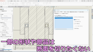 その様な場合には、部品を限定して断面表示にしたり 部分的に半透明表示にすることで、全体の形を確認しながら断面表示にすることができます。